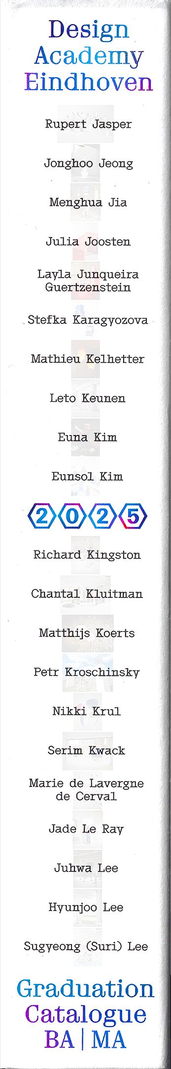 The aim of the design of this catalogue was to move beyond a flat, one-dimensional representation of design and instead offer a dynamic, multifaceted view of designers and their work. It creates a space where different voices, stories, and layers meet, emphasising complexity, ambiguity, and the human presence at the core of design.Reflecting the layered nature of both the graduates and their projects, the catalogue presents not only polished outcomes but also personal perspectives and processes, allowing each student to articulate their position and the relational context of their work.